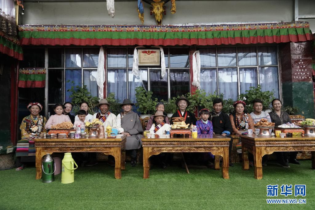 西藏日喀则市桑珠孜区东嘎乡加吾岗村退役老兵平措(右六)与家人合影(7月27日摄)。新华社记者 黄康懿 摄