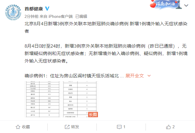 北京8月4日新增3例京外关联本地新冠肺炎确诊病例 新增1例境外输入无症状感染者