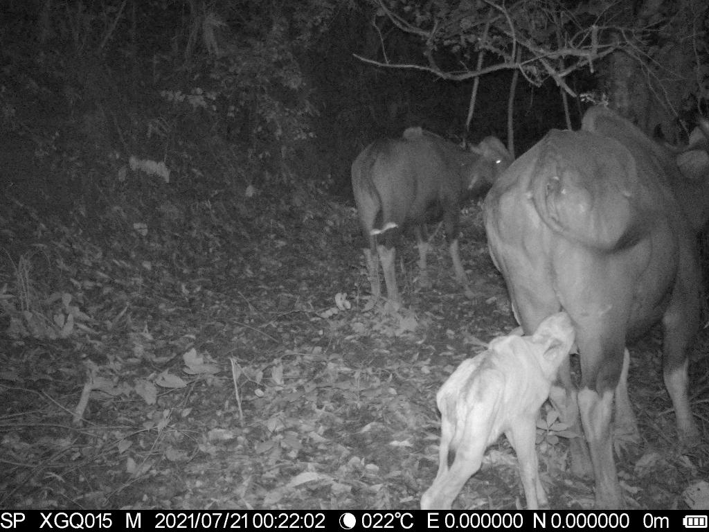 这是糯扎渡省级自然保护区管护局工作人员在整理安放在野外的红外相机时发现的。画面显示,一头体型壮硕的成年印度野牛正穿过一片林子,其后紧跟着一头毛发呈黄色的幼崽。该保护区管护局资源保护科科长钱寿文介绍,红外相机画面显示,7月20日该头母牛臀部有血迹,且警觉性较高,次日发现了这头小牛,由此推断幼崽出生日期在7月20日左右。