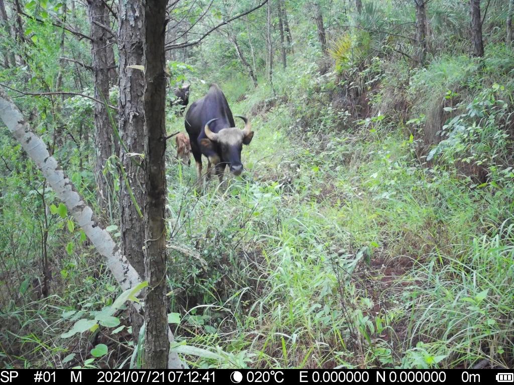 据悉,印度野牛栖息于热带、亚热带原始阔叶林中,为国家一级重点保护动物。云南糯扎渡省级自然保护区是我国境内印度野牛的主要栖息地之一,2018年的调查数据显示,该区域约有27头印度野牛活动。