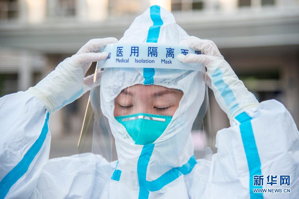 ↑ 在武昌区水果湖街道茶港社区,武汉大学中南医院创伤与显微骨科护士张祥翰在穿戴防护服