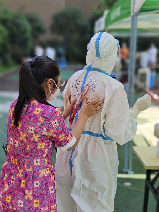 进行全员核酸检测的医护人员的防护服已经湿透
