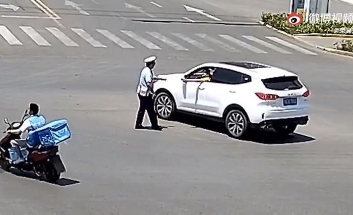 一小车司机路过为交警递上一瓶矿泉水