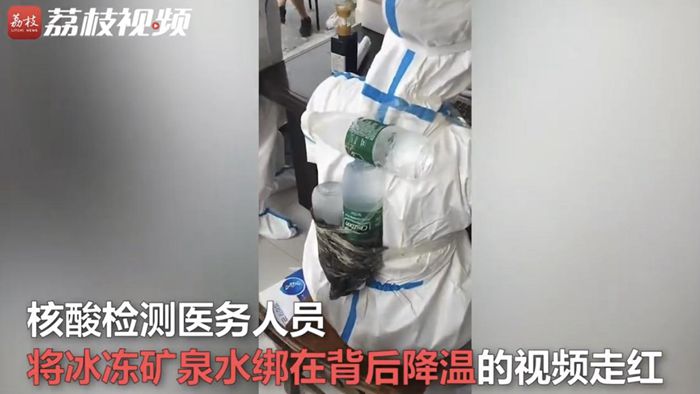 医护人员们将冰冻矿泉水绑在背后