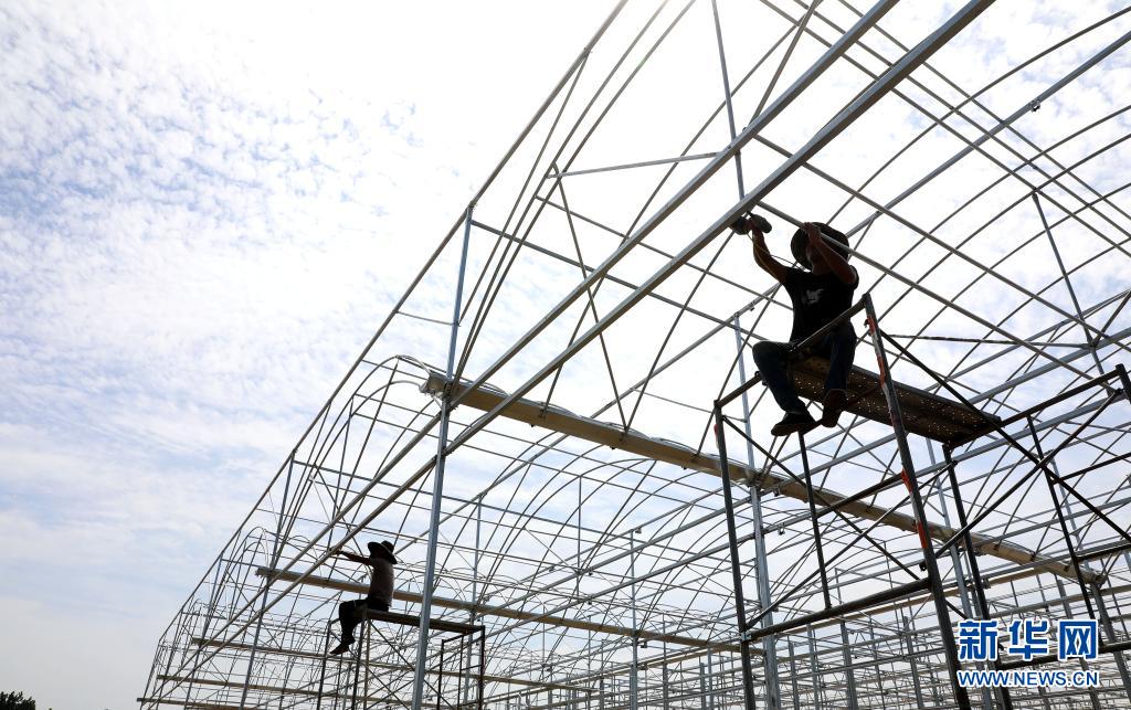 工人冒着高温建设平山县育苗中心