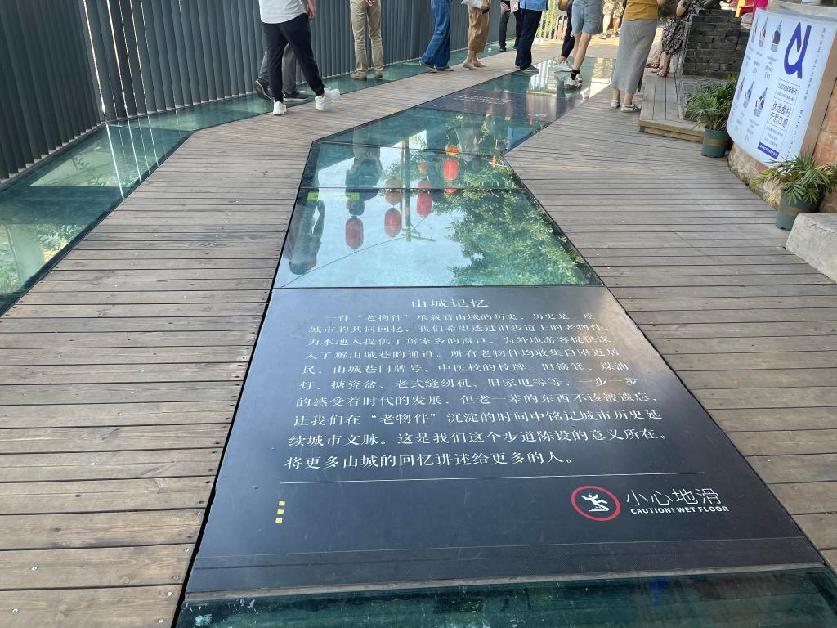 记者近日在山城巷看到,部分建筑被拆除、增设了架空层,一条宽为1.5米至2米的栈道斗折蛇行,透过加装玻璃还能看到原本狭窄的土栈道;堆满垃圾的废墟打造成为“荒野花园”,正在提升修缮。
