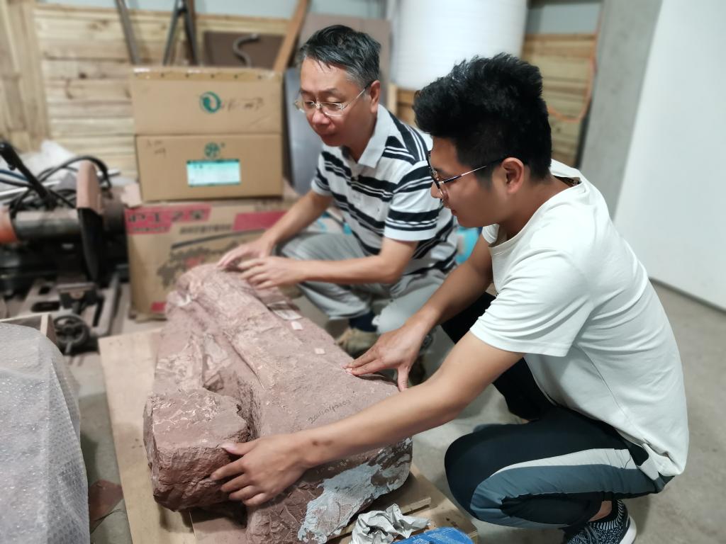 正在修复的这头恐龙的化石,也是和中国缙云甲龙化石一起出土的。金幸生估计,它应该是个大块头,估计有十几米长、几十吨重。“化石从缙云运到杭州,装了两卡车。”
