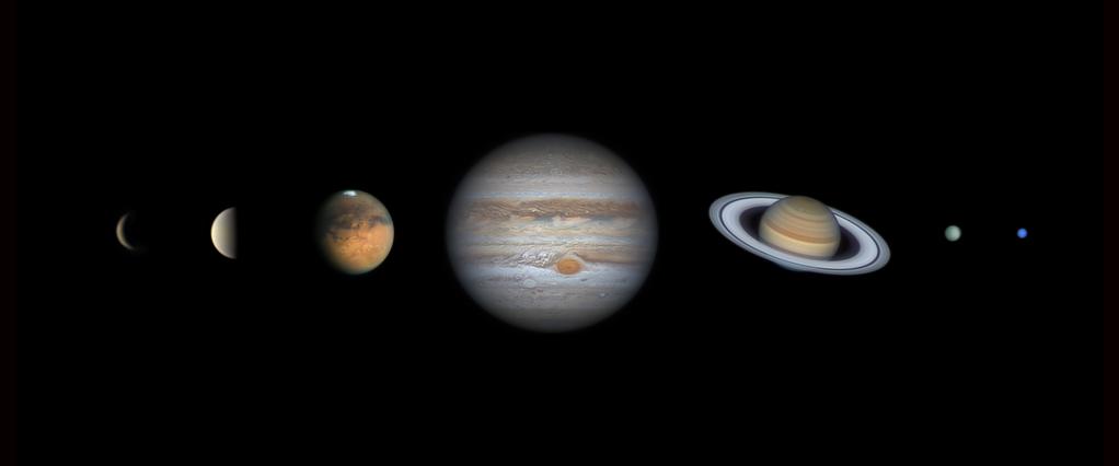 广东省天文爱好者周志伟2020年拍摄的水星、金星、火星、木星、土星、天王星、海王星(多张叠加)。(本人供图)