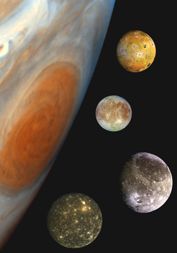 木星大红斑与四颗伽利略卫星合成图。(图片来源美国国家航空航天局官方网站)