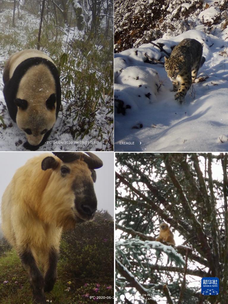 这张拼版照片显示的是大熊猫国家公园大邑管护总站近年来拍摄到的部分野生动物,左上为大熊猫,右上为雪豹,左下为羚牛,右下为金丝猴(资料照片)。新华社发