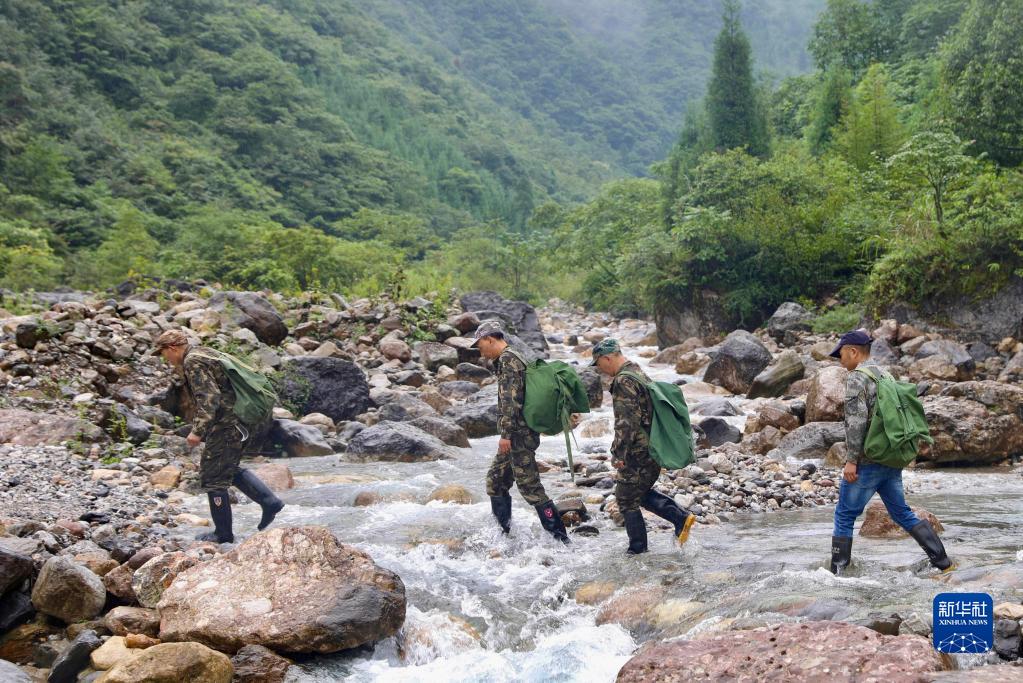 8月25日,在大熊猫国家公园四川片区大邑区域,大蒜坪管护站的巡护队员在渡河。新华社记者 高搏扬 摄