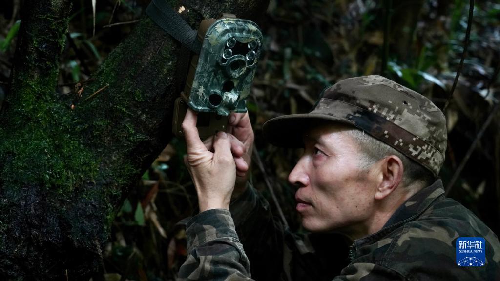 8月25日,在大熊猫国家公园四川片区大邑区域,大蒜坪管护站巡护队长张学良在安装红外相机。新华社发(陈居伟 摄)