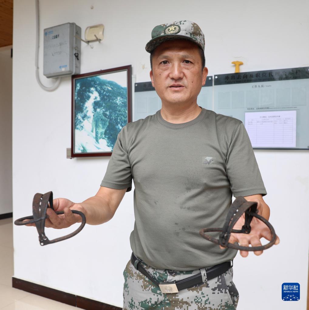 8月25日,在大熊猫国家公园四川片区大邑区域,大蒜坪管护站负责人庞明建向记者展示巡护查获的捕猎器具。新华社记者 高搏扬 摄