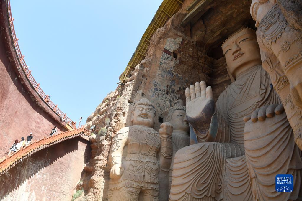8月20日,游客在完成修复的天梯山石窟第13窟参观。新华社记者 陈斌 摄