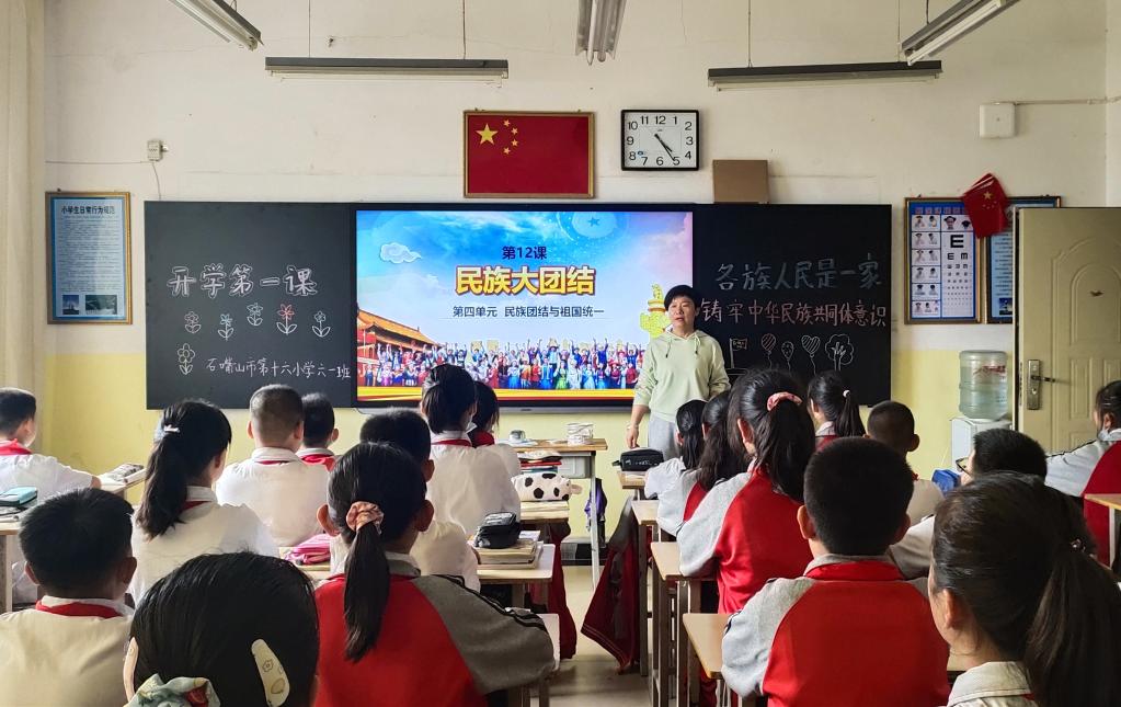 刚刚结束的开学第一课上,宁夏石嘴山市第十六小学六年级二班班主任高阳以“民族团结”为题,给全班40多名学生上了生动的一课。课上,高阳讲述了著名的单家集夜话故事,用发生在宁夏的民族团结佳话,把民族团结的种子埋在了每一位同学的心里。