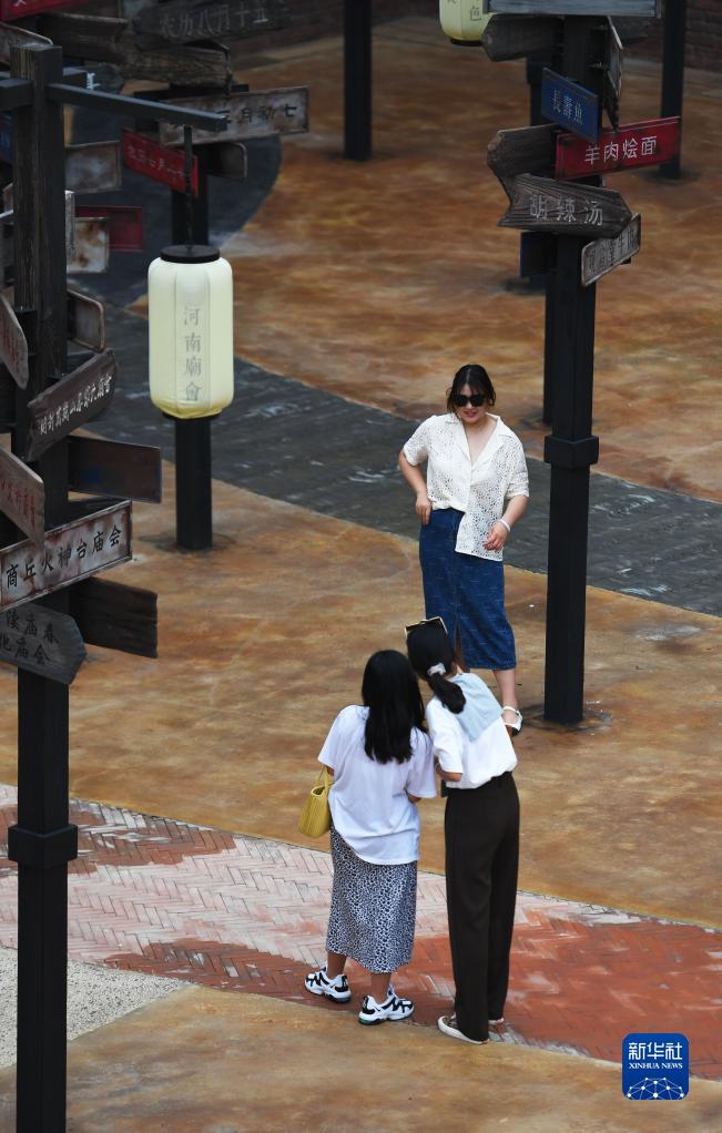 9月3日,游客在“只有河南·戏剧幻城”内参观留影。