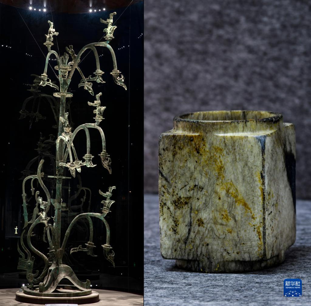 拼版照片:左图是在位于四川德阳广汉市的三星堆博物馆拍摄的1号青铜神树(3月17日摄,新华社记者 沈伯韩 摄);右图是在四川省文物考古研究院三星堆考古研究所拍摄的三星堆遗址3号“祭祀坑”出土的刻有神树纹的玉琮(9月2日摄,新华社记者 王曦 摄)。 新华社发