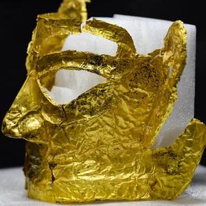 这件金面具6月中旬在三星堆遗址3号“祭祀坑”出土。当考古人员从3号“祭祀坑”缓慢取出一块青铜罍残片后,一团被压得严重变形的金器出现在人们眼前。出土时,这件金器仿佛一张稿纸被揉成一团,难辨形状。修复人员用不到一周时间,一张完整的金面具缓缓呈现。
