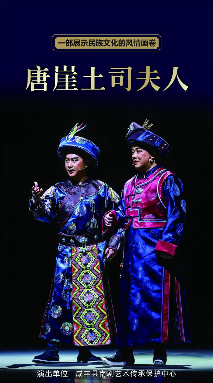 由湖北省咸丰县南剧艺术传承保护中心创作的《唐崖土司夫人》,是一部以世界文化遗产唐崖土司城址及其历史素材为依托、以明朝万历年间土家族杰出女性土司夫人覃田氏为原型的大型民族历史剧。