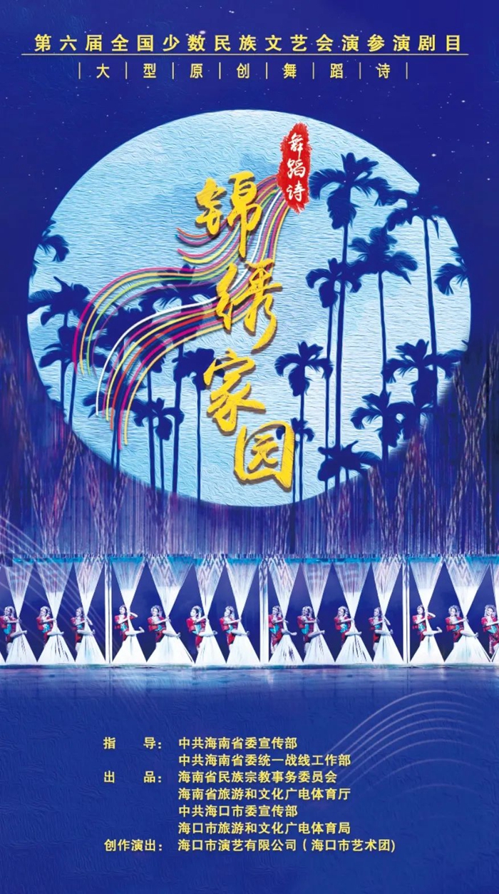 由海南省代表团选送、海口市艺术团创作演出的原创舞蹈诗《锦绣家园》,9月7日起亮相第六届全国少数民族文艺会演,在央视网和国家民委门户网站进行网络展播。该剧讲述了乡村振兴工作队队员、共产党员辰星来到海南黎乡,带领各族同胞描绘梦想蓝图、共建美好家园的故事。