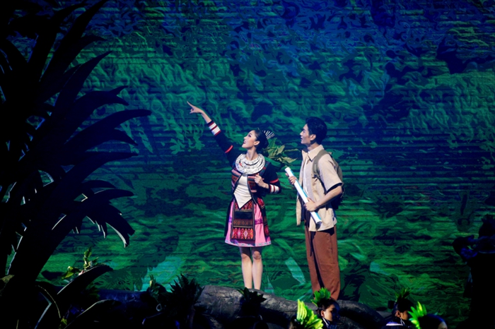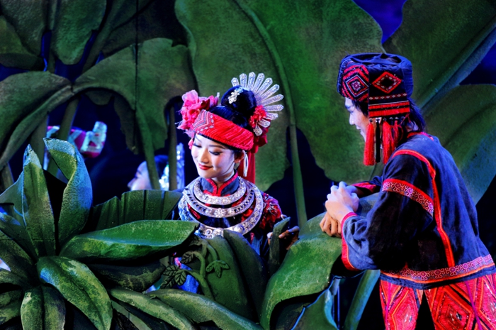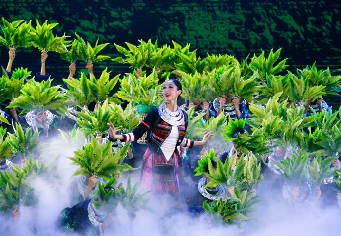 千百年来,黎族同胞形成了与自然和谐共生的生产生活方式。在舞台上,黎族姑娘们用蕉叶作伞,椰壳作鞋,采摘于山野,纺线于月下,椰树婆娑,槟榔茂密,山风拂面,竹节作响,海南的灵秀山水跃然于眼前。这些天人和谐的画面,不仅直观展现了黎族同胞质朴的生活智慧,也是对“绿水青山就是金山银山”的生动诠释。