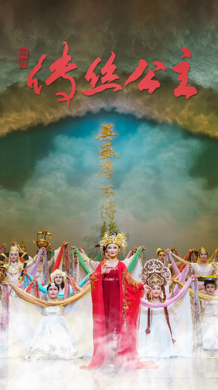 《传丝公主》以唐朝玄奘《大唐西域记》中“瞿萨旦那国”(今新疆和田地区)一条关于蚕种西传的史料记载为依据,以新疆丹丹乌里克遗址发掘的唐代木板画“传丝公主”的文物遗存为印证,以于阗王子与唐朝公主将东方蚕桑丝绸首传西域的故事为载体,再现了1300年前我国各民族文化上兼收并蓄,经济上相互依存,情感上相互亲近,在互鉴融通中汇聚成多元一体的中华民族的历史。