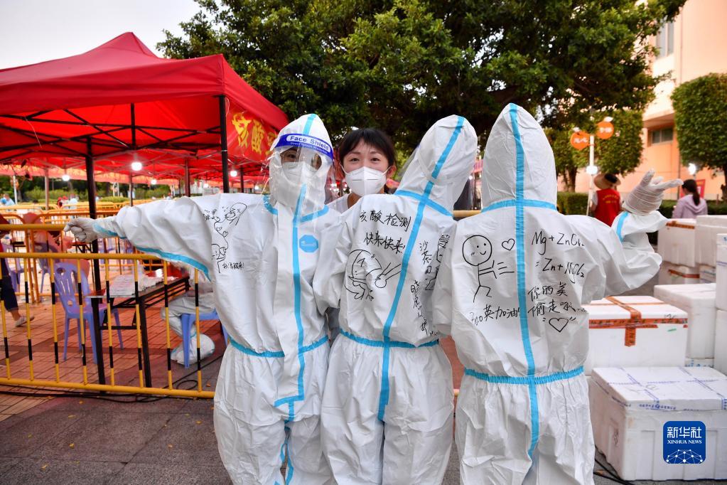 9月16日,在厦门市湖里区金尚小区核酸检测点,厦门市金尚中学几名教师志愿者在一起合影。 新华社记者 姜克红 摄
