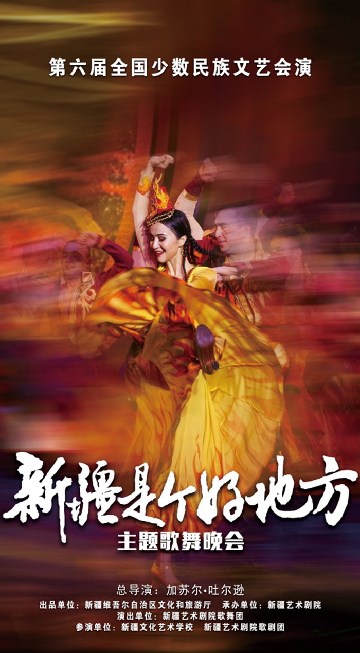 新疆维吾尔自治区参演剧目《新疆是个好地方》以歌舞晚会的形式,向全国观众呈现多彩新疆、团结新疆、大美新疆,全面展示党的十八大以来新疆发生的翻天覆地的变化和各族群众良好的精神风貌。