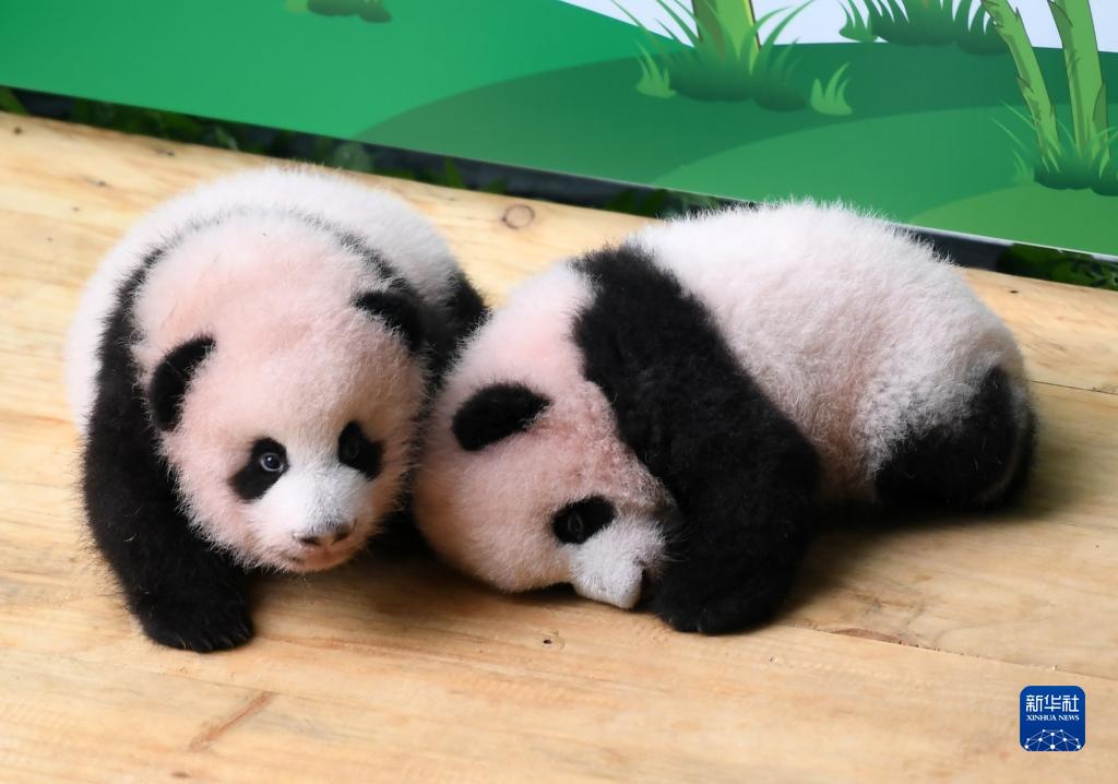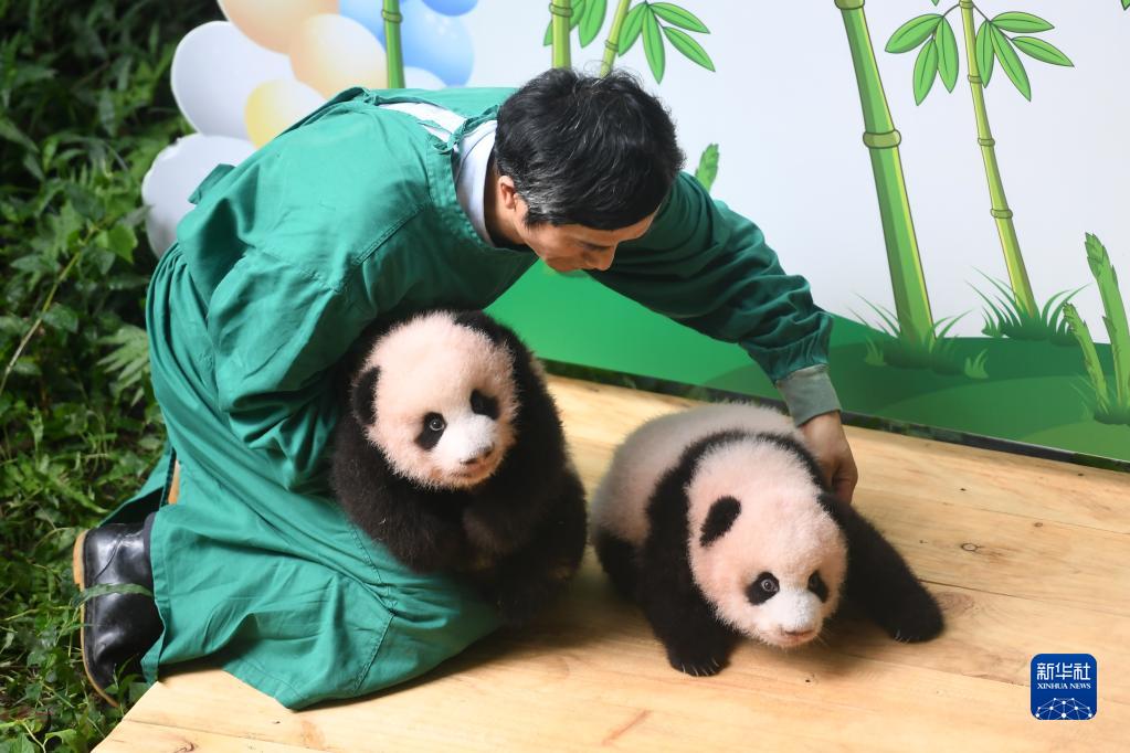 9月17日,大熊猫双胞胎在满百天征名活动上。 新华社记者 唐奕 摄