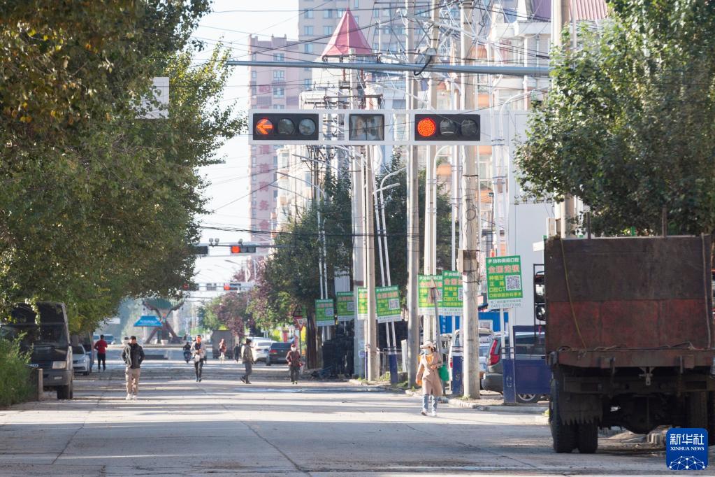 9月24日,居民在黑龙江省哈尔滨市巴彦县一街道上行走。据了解,巴彦县对部分地区实行交通信号灯红灯管制。