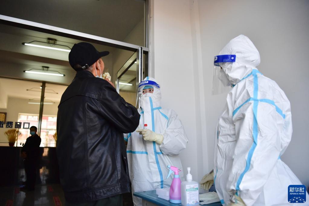 在哈尔滨市巴彦县兴隆镇一处核酸检测点,医务人员为居民进行核酸检测取样(9月23日摄)。