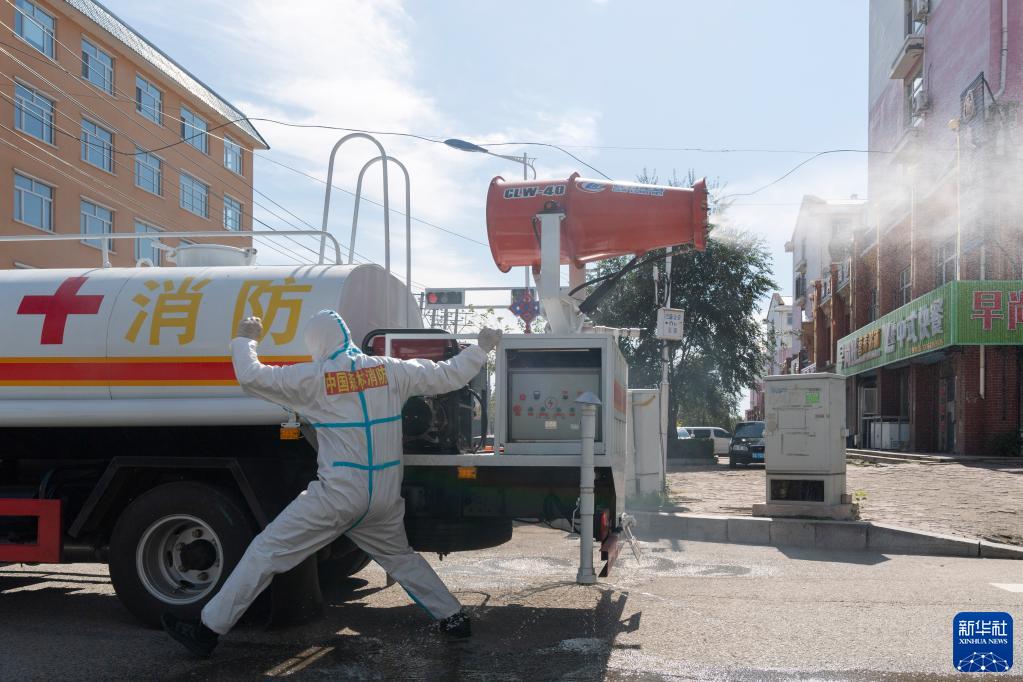 9月24日,在哈尔滨市巴彦县兴隆镇,哈尔滨市森林消防支队兴隆大队的消防员开启车上的消杀设备。