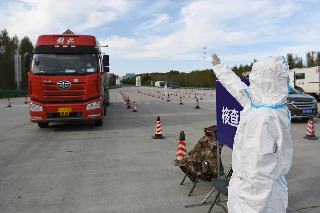 在哈尔滨一高速公路出城口,工作人员示意停车准备检查车内人员的核酸检测报告(9月23日摄)。新华社记者王建威摄