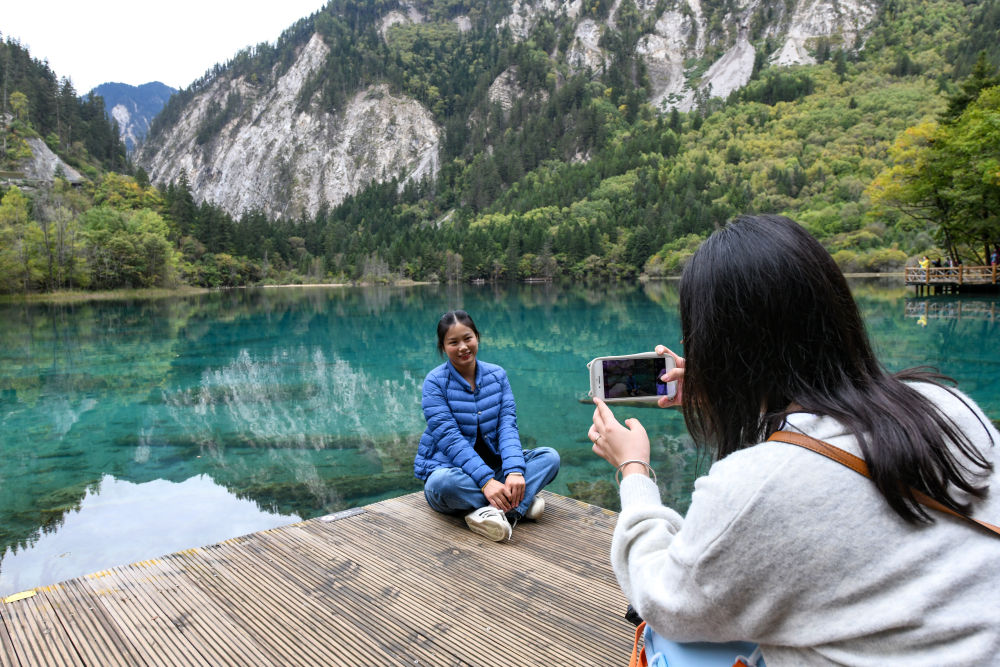 ↓ 2021年9月27日,游客在五花海边拍照留念。