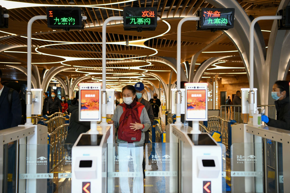 ↑ 9月28日,游客通过智能检票口进入九寨沟景区。