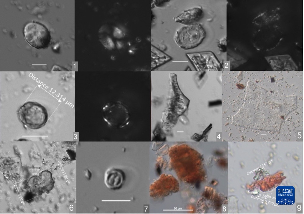 这是从仰韶村遗址小口尖底瓶样品中提取到的微体化石,包括淀粉粒、植硅体、霉菌和酵母等(拼版照片)。新华社发(河南省文物考古研究院提供)