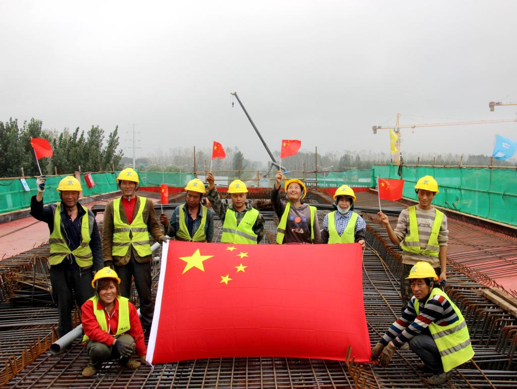 10月1日,在中建八局郑济高铁二标段施工现场,工人庆祝国庆节。新华社记者 范长国 摄