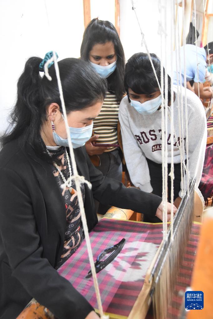 10月3日,北京大学留学生在和田参观手工艾德莱斯绸织造。新华社记者 张晓龙 摄