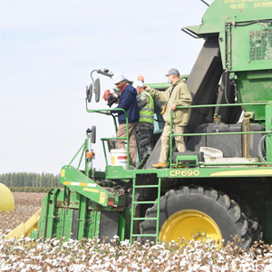 10月5日,北京大学留学生在新疆石河子参观棉花种植,来自孟加拉国的北京大学元培学院留学生阳光(左一)登上一台采棉机拍摄视频。新华社记者 张晓龙 摄