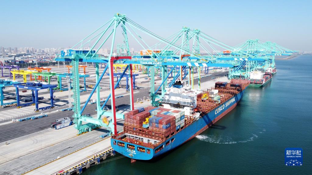 10月17日,船舶停靠在天津港北疆港区C段智能化集装箱码头(无人机照片)。新华社记者 赵子硕 摄