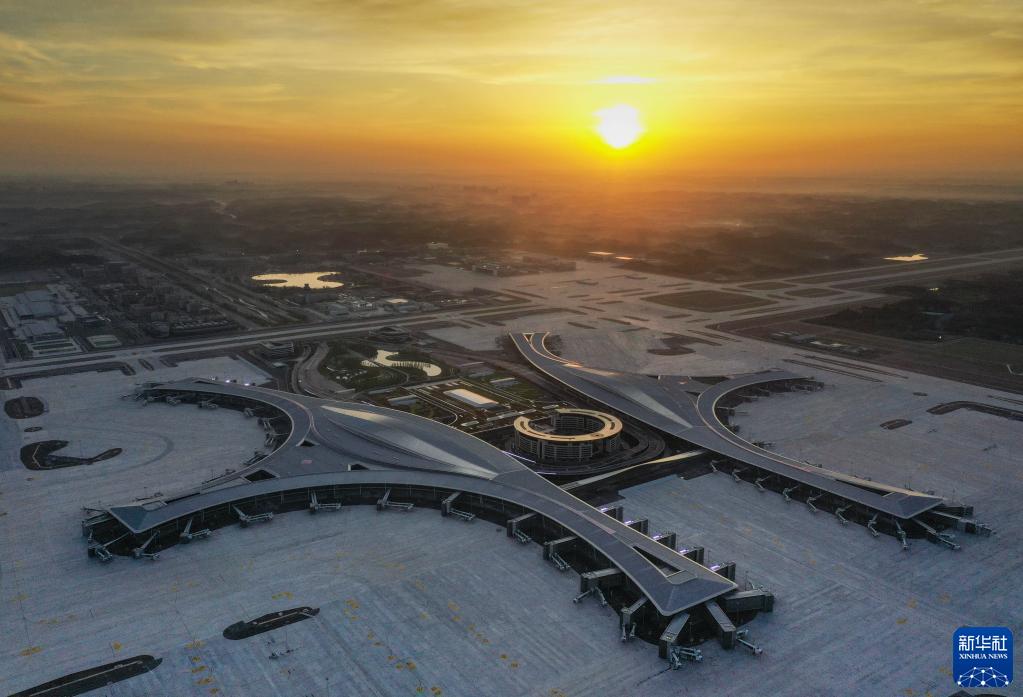 这是6月5日拍摄的日出时分的成都天府国际机场(无人机照片)。6月27日,我国“十三五”期间规划建设的最大民用运输枢纽机场——成都天府国际机场正式启用。新华社发(何海洋 摄)