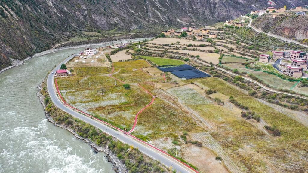 这是10月20日在四川甘孜藏族自治州新龙县拍摄的雅砻江边的仁乃农旅融合示范园。新华社记者 王曦 摄