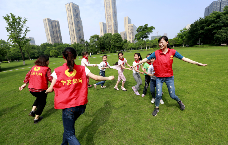 宁波市鄞州区“宁波妈妈”志愿者团队带领当地云龙育英民工子弟学校的孩子们走进鄞州公园,开展放风筝、写生、集体游戏等多种户外活动。图为临近“六一”儿童节,志愿者和孩子们一起玩“老鹰捉小鸡”游戏