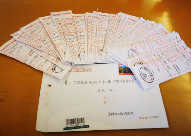 2020年11月27日,署名“然然”的一封厚厚的挂号信,从“宁波市中山路1号”这个不存在的地址,“如约”寄到了宁波市慈善总会。里面是一叠厚厚的汇款单,共105张,其中103张汇款金额是9999元,1张50元,1张53元,累计103万元。