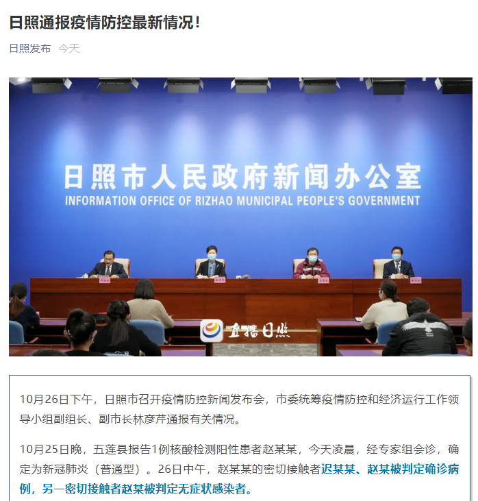 10月25日晚,五莲县报告1例核酸检测阳性患者赵某某,今天凌晨,经专家组会诊,确定为新冠肺炎(普通型)。26日中午,赵某某的密切接触者迟某某、赵某被判定确诊病例,另一密切接触者赵某被判定无症状感染者。