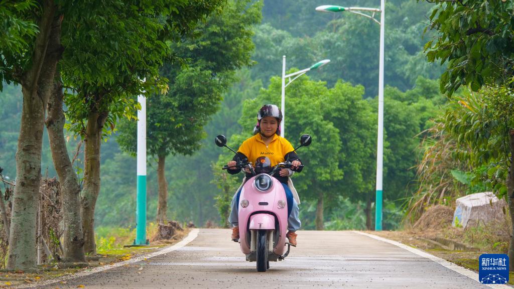 10月26日,在福州市罗源县竹里村,雷雨宸的妈妈郑晓芳骑电动车送女儿上学。新华社发(周义摄)