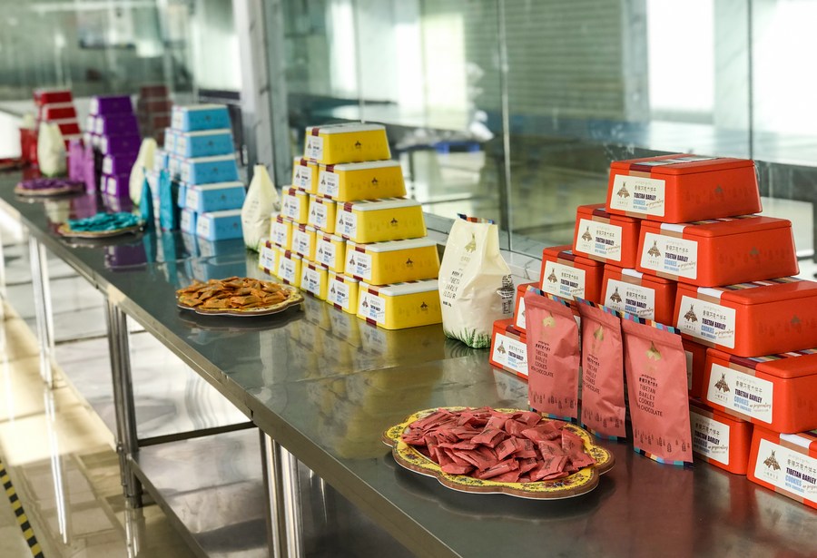 图为甘孜县格萨尔青稞文化园区研发生产的各种青稞产品。新华社记者王曦 摄