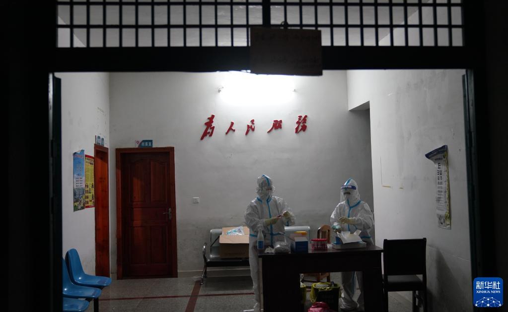 11月1日,医护人员在铅山县城南社区的核酸采样点进行采样。新华社记者 胡晨欢 摄