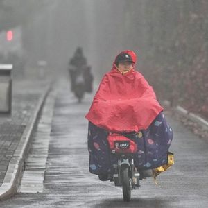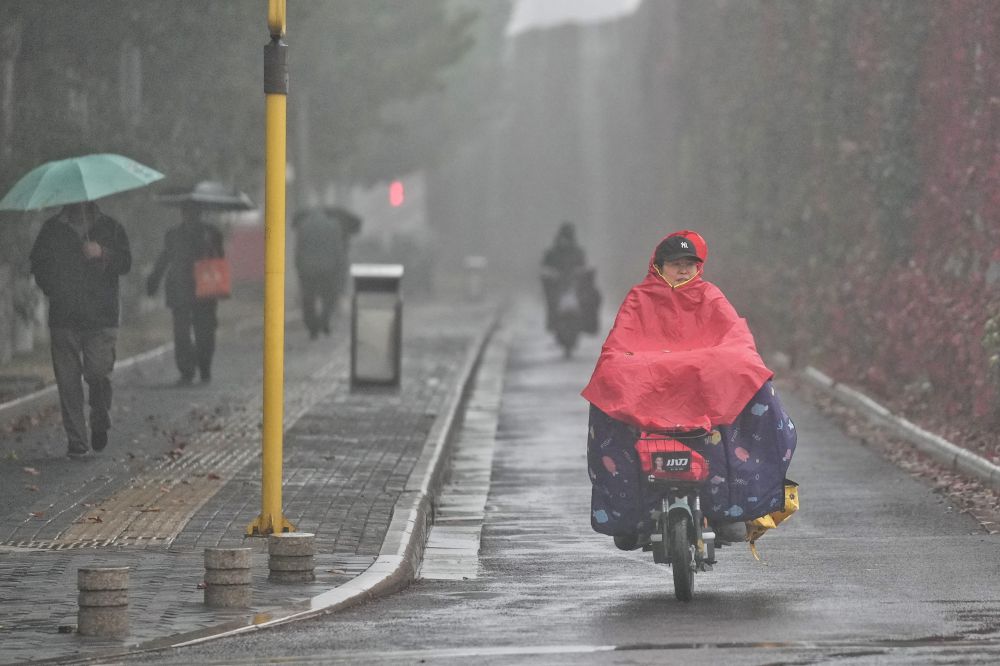 图为11月6日,北京市大兴区亦庄镇,一名女士在雨中骑行。(新华社记者彭子洋 摄)