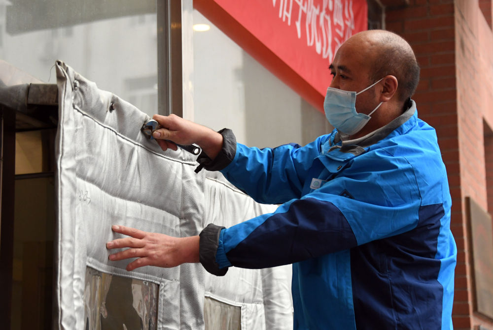 图为11月6日,在北京交通大学机械工程楼,工作人员安装楼门棉门帘。(新华社记者任超 摄)